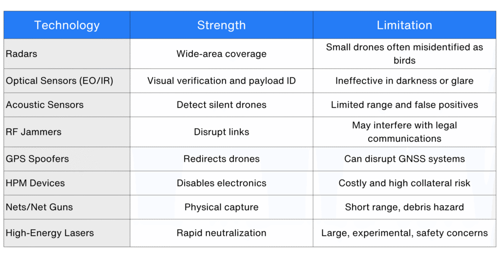 A pesar de la rápida innovación, ningún método ofrece una solución completa o exenta de riesgos, especialmente en entornos civiles regulados. Cada método de detección y mitigación tiene sus limitaciones: puntos ciegos técnicos, dependencias medioambientales y restricciones legales o de seguridad.
